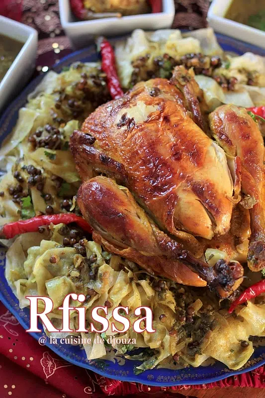 La cuisine berbère (ou cuisine amazigh) est une cuisine traditionnelle ancestrale commune aux habitants d’Afrique du Nord. Parmi ses nombreux plats, on y retrouve la Rfissa, une savoureuse et délicieuse préparation à base de feuilles de trid (ou rougag) découpées finement pour être arrosées d’une sauce gouteuse sans tomates, préparée au poulet et agrémentée de lentilles, de graines de fenugrec et d’épices.