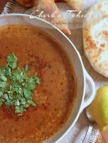 Chorba tunisienne tchicha Cette Chorba tunisienne à la semoule d’orge tchicha est une soupe très populaire chez nos voisins tunisiens au Ramadan. Une belle soupe épaisse à la tomate très savoureuse……
